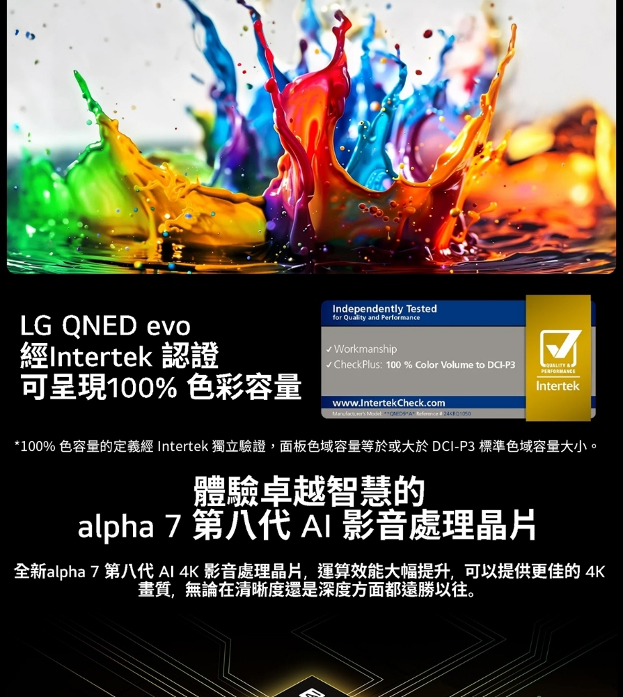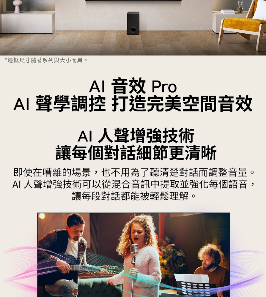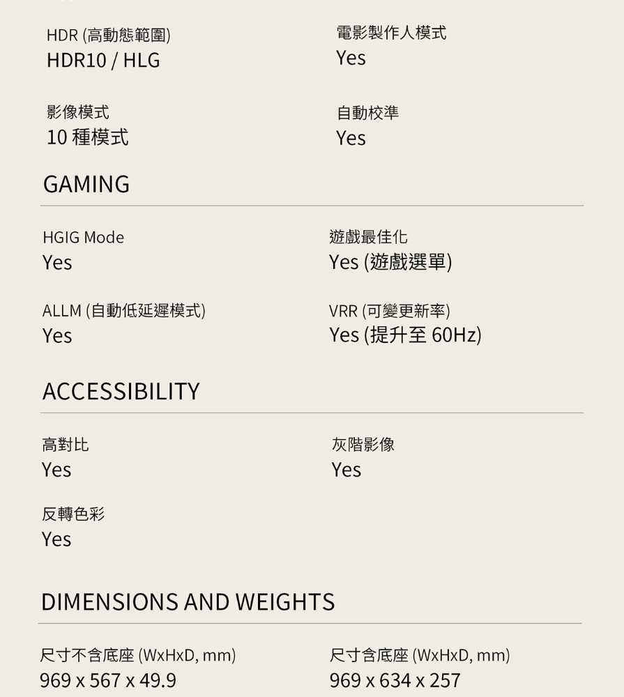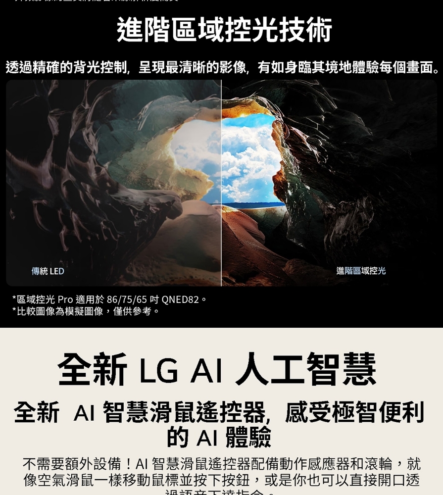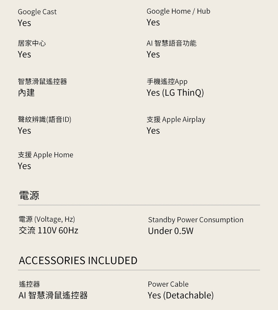 全新動態 QNED Color | 提供更豐富飽滿的色彩表現 區域控光技術 | 畫面色彩準確、減少光暈,呈現最細膩的細節 全新AI智慧滑鼠遙控器 | 透過AI 搜尋、聲紋辨識、語音控制更便利 4K Ultra HD (3,840 x 2,160) Dynamic QNED 色彩顯示技術 影像 (處理技術) 影像處理器 α7 第八代 AI 4K 影音處理晶片 AI 智慧影像升頻4K 智慧影像超級升頻 AI 動態色彩調節技術 YesAI 亮度設定 Yes HDR (高動態範圍) HDR10 / HLG 影像模式 10 種模式 自動校準 YesHGIG Mode Yes 遊戲最佳化 Yes (遊戲選單) ALLM (自動低延遲模式) Yes VRR (可變更新率) Yes (提升至 60Hz) 高對比 Yes灰階影像 Yes反轉色彩 Yes 尺寸不含底座 (WxHxD, mm)969 x 567 x 49.9 尺寸含底座 (WxHxD, mm) 969 x 634 x 257 重量含底座 (kg) 9.8 VESA璧掛規格 (WxH, mm) 200 x 200 α7 AI 音效 Pro (模擬 9.1.2 環繞音效) 音效模式共用 Yes 同步音效輸出 Yes 藍芽環繞音效就緒 Yes (雙向播放) 音效輸出 20W AI Acoustic Tuning Yes AC4, AC3(Dolby Digital), EAC3, HE-AAC, AAC, MP2, MP3, PCM, apt-X (參考使用手冊) 揚聲器類型2.0 聲道 HDMI 音訊回傳通道 eARC (HDMI 2) 藍牙支援 Yes (v 5.0) 乙太網路 1組 Simplink (HDMI CEC) Yes SPDIF (光纖數位音訊輸出) 1組 HDMI Input 3組 (支援符合eARC、ALLM) USB 輸入 1組 (v 2.0 Wi-Fi Yes (Wi-Fi 5) AI 聊天機器人YesAI 智慧語音功能 Yes 手機遙控App Yes (LG ThinQ) 聲紋辨識(語音ID) Yes 支援 Apple Airplay Yes支援 Apple Home Yes 遙控器AI 智慧滑鼠遙控器 |