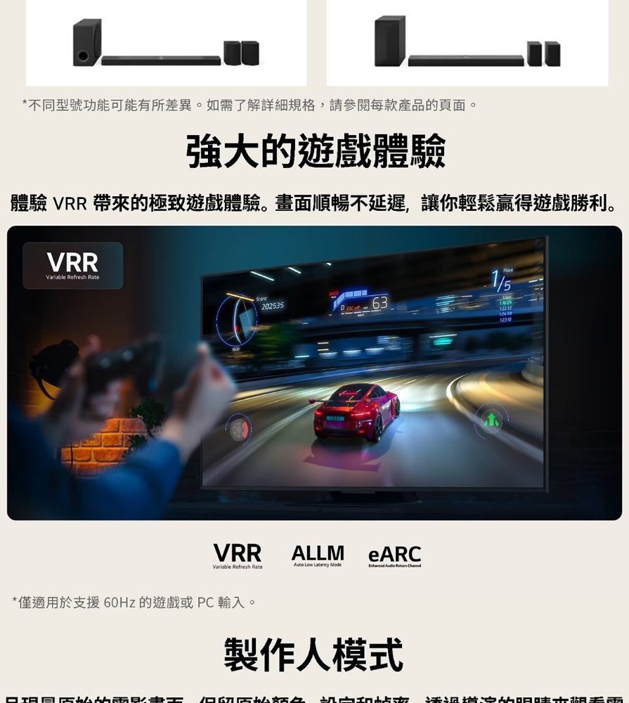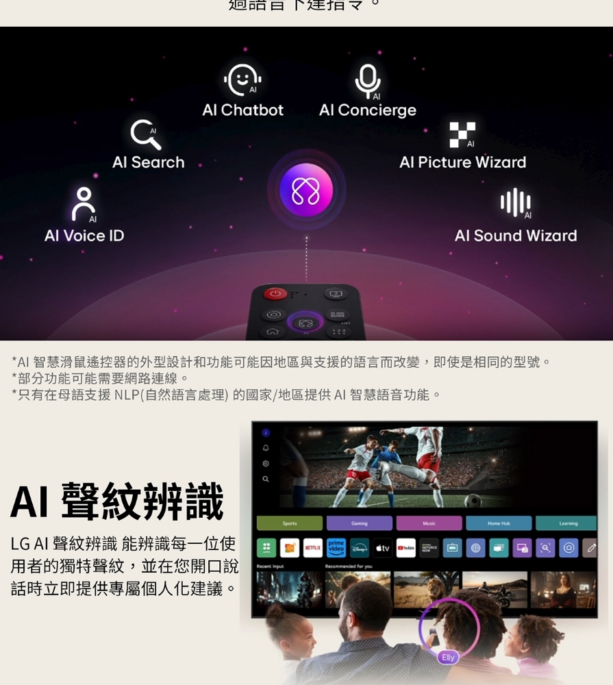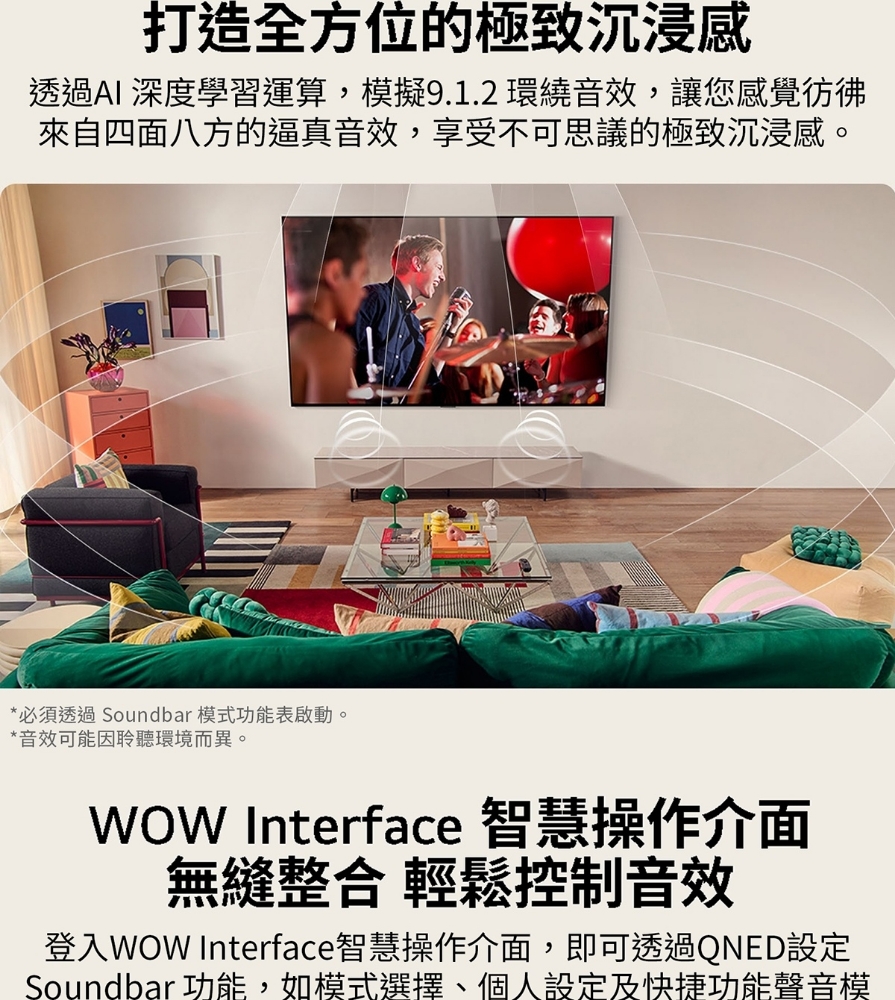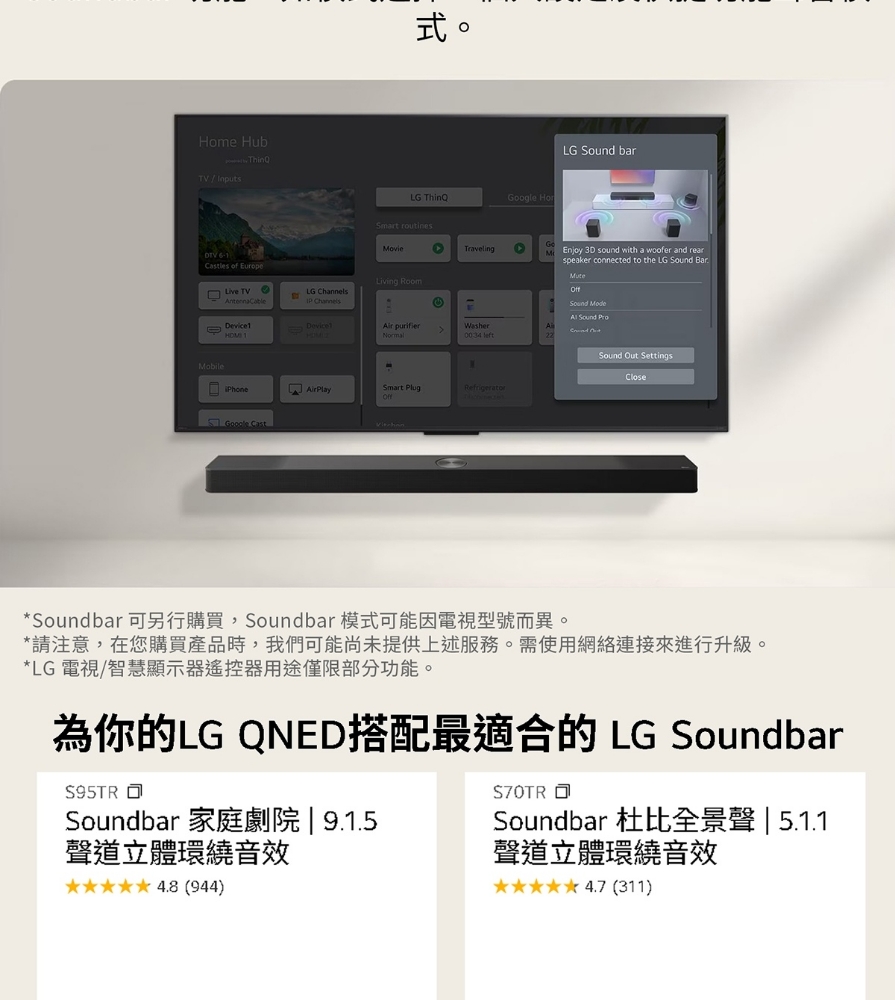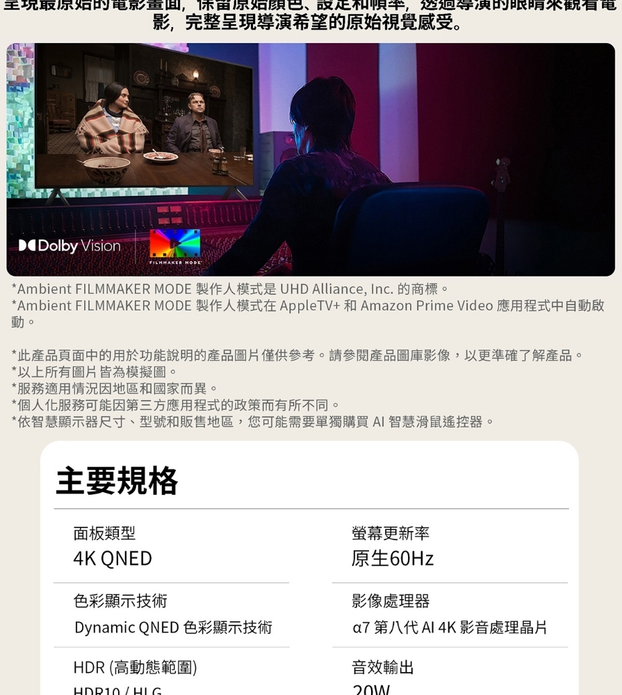 全新動態 QNED Color | 提供更豐富飽滿的色彩表現 區域控光技術 | 畫面色彩準確、減少光暈,呈現最細膩的細節 全新AI智慧滑鼠遙控器 | 透過AI 搜尋、聲紋辨識、語音控制更便利 4K Ultra HD (3,840 x 2,160) Dynamic QNED 色彩顯示技術 影像 (處理技術) 影像處理器 α7 第八代 AI 4K 影音處理晶片 AI 智慧影像升頻4K 智慧影像超級升頻 AI 動態色彩調節技術 YesAI 亮度設定 Yes HDR (高動態範圍) HDR10 / HLG 影像模式 10 種模式 自動校準 YesHGIG Mode Yes 遊戲最佳化 Yes (遊戲選單) ALLM (自動低延遲模式) Yes VRR (可變更新率) Yes (提升至 60Hz) 高對比 Yes灰階影像 Yes反轉色彩 Yes 尺寸不含底座 (WxHxD, mm)969 x 567 x 49.9 尺寸含底座 (WxHxD, mm) 969 x 634 x 257 重量含底座 (kg) 9.8 VESA璧掛規格 (WxH, mm) 200 x 200 α7 AI 音效 Pro (模擬 9.1.2 環繞音效) 音效模式共用 Yes 同步音效輸出 Yes 藍芽環繞音效就緒 Yes (雙向播放) 音效輸出 20W AI Acoustic Tuning Yes AC4, AC3(Dolby Digital), EAC3, HE-AAC, AAC, MP2, MP3, PCM, apt-X (參考使用手冊) 揚聲器類型2.0 聲道 HDMI 音訊回傳通道 eARC (HDMI 2) 藍牙支援 Yes (v 5.0) 乙太網路 1組 Simplink (HDMI CEC) Yes SPDIF (光纖數位音訊輸出) 1組 HDMI Input 3組 (支援符合eARC、ALLM) USB 輸入 1組 (v 2.0 Wi-Fi Yes (Wi-Fi 5) AI 聊天機器人YesAI 智慧語音功能 Yes 手機遙控App Yes (LG ThinQ) 聲紋辨識(語音ID) Yes 支援 Apple Airplay Yes支援 Apple Home Yes 遙控器AI 智慧滑鼠遙控器 |