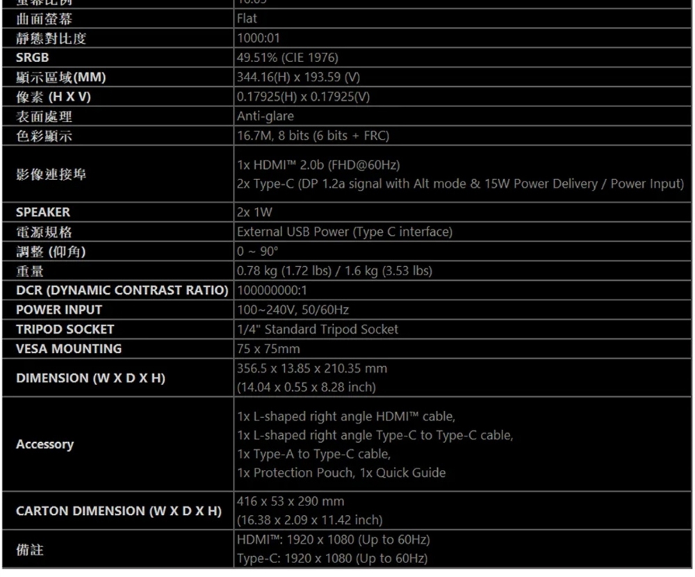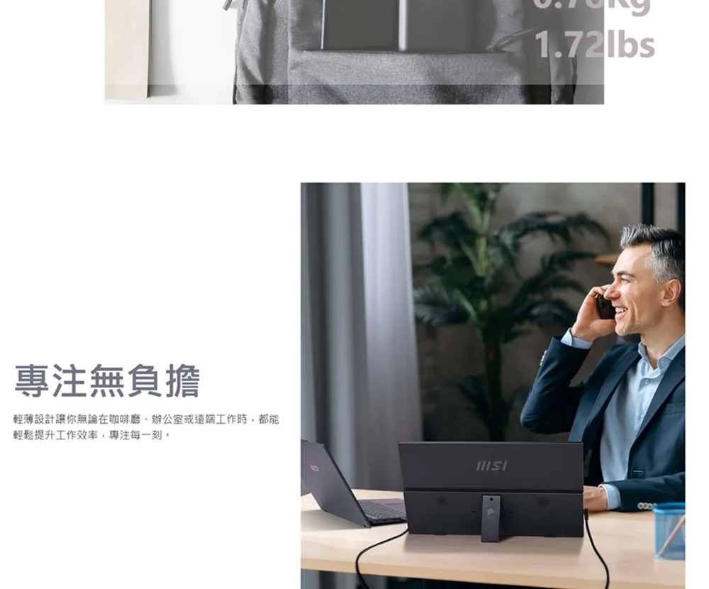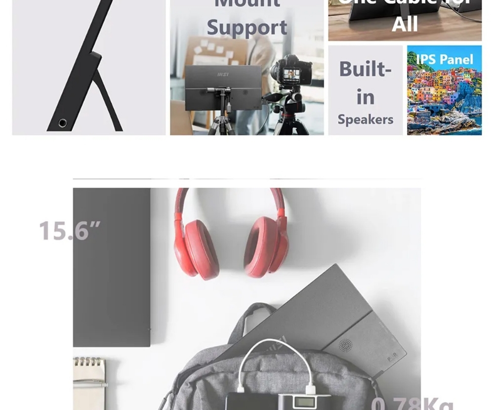 15.6 吋 FHD IPS 顯示器- 提升您的觀賞體驗 僅0.78 公斤,便攜式設計,配有保護袋,讓您輕鬆攜帶,毫無負擔 內建揚聲器- 讓您在移動時也能享受出色的音訊體驗