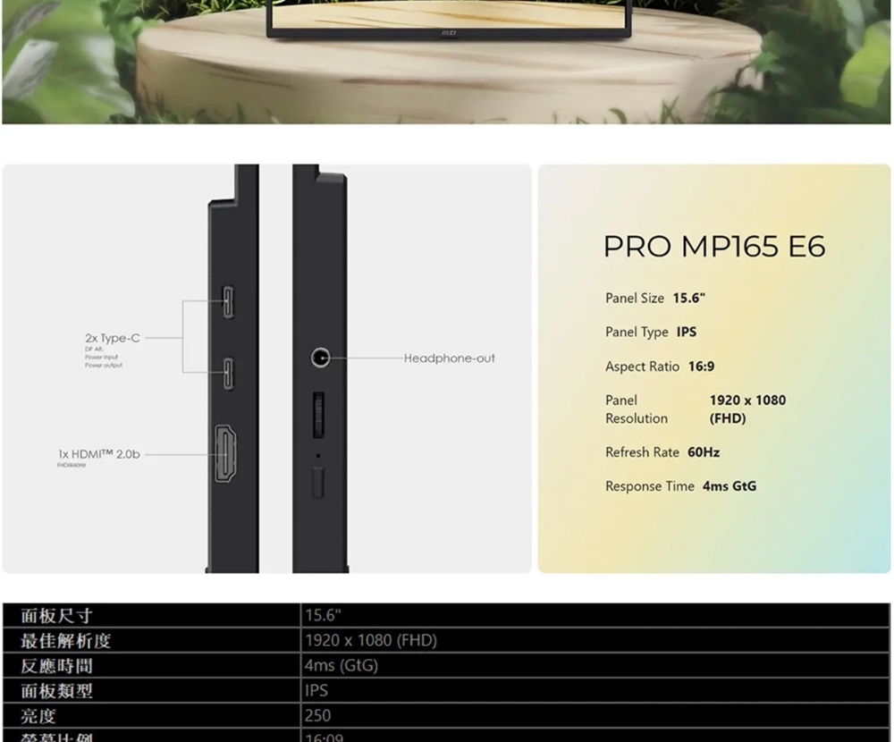 MSI 微星PRO MP165 E6 可攜式螢幕 (16型/FHD/Type C/喇叭/IPS)+LED觸控護眼螢幕掛燈 33cm款