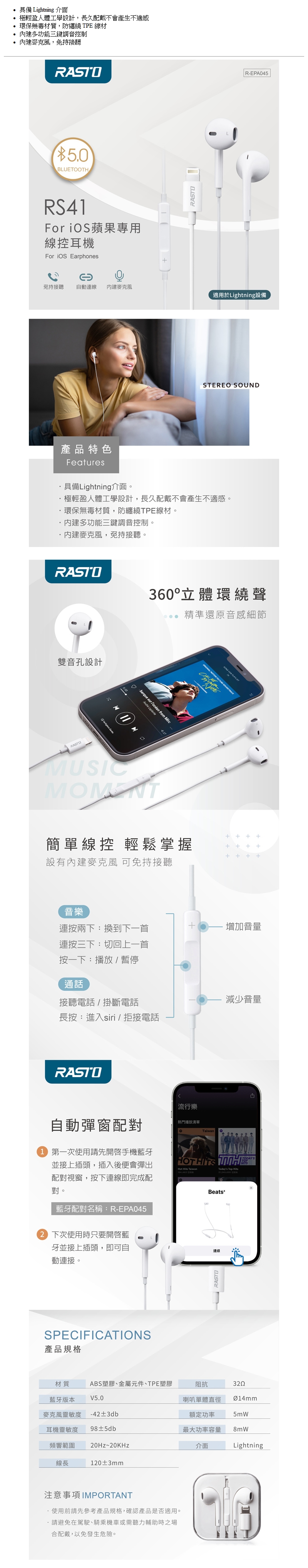 RASTO For iOS蘋果專用線控耳機