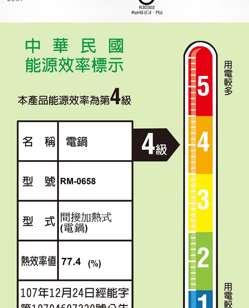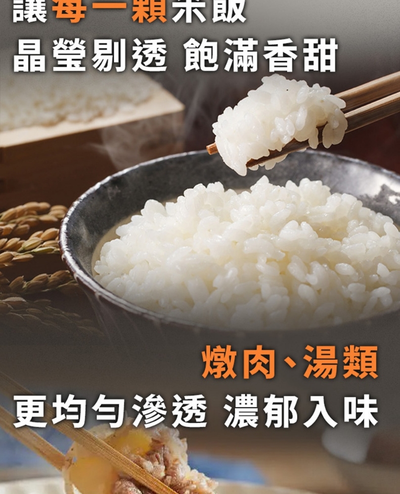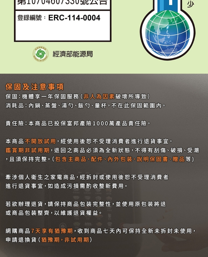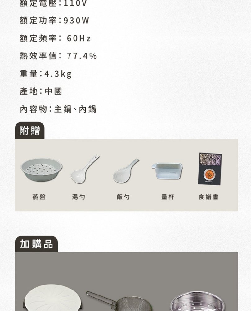 類型:微電腦電子鍋 容量:7~10人份 保固期:1年保固期 機體享一年保固服務(非人為因素破壞所導致)消耗品:內鍋、蒸盤、湯勺、飯勺、量杯,不在此保固範圍內。 商品規格 產地:中國 保固:機體享一年保固服務(非人為因素破壞所導致)消耗品:內鍋、蒸盤、湯勺、飯勺、量杯,不在此保固範圍內。 材質:機體:PP 聚丙烯 內鍋:鋁合金、日本大金塗層 保温蓋:鋁合金 蒸氣閥:食品級耐熱 PP 保溫蓋密封圈、蒸氣孔密封圈:食品級耐熱矽膠耐熱:蒸盤105℃、蒸氣閥110℃ / 密封圈 120℃ 尺寸(L*W*H):33.2x28.3x22.8(cm) 重量:4.3kg 標準配備AI電子鍋、內鍋、蒸盤、湯勺、飯勺、量杯*1 認證字號 商檢字號:ERC-1140004 |