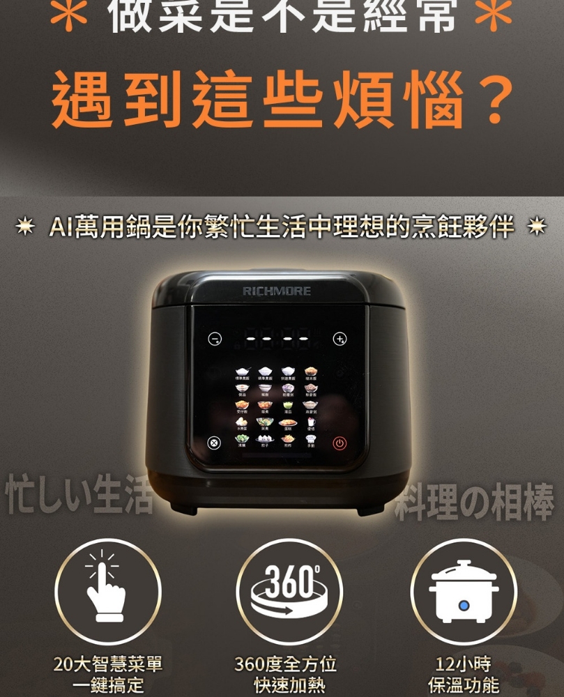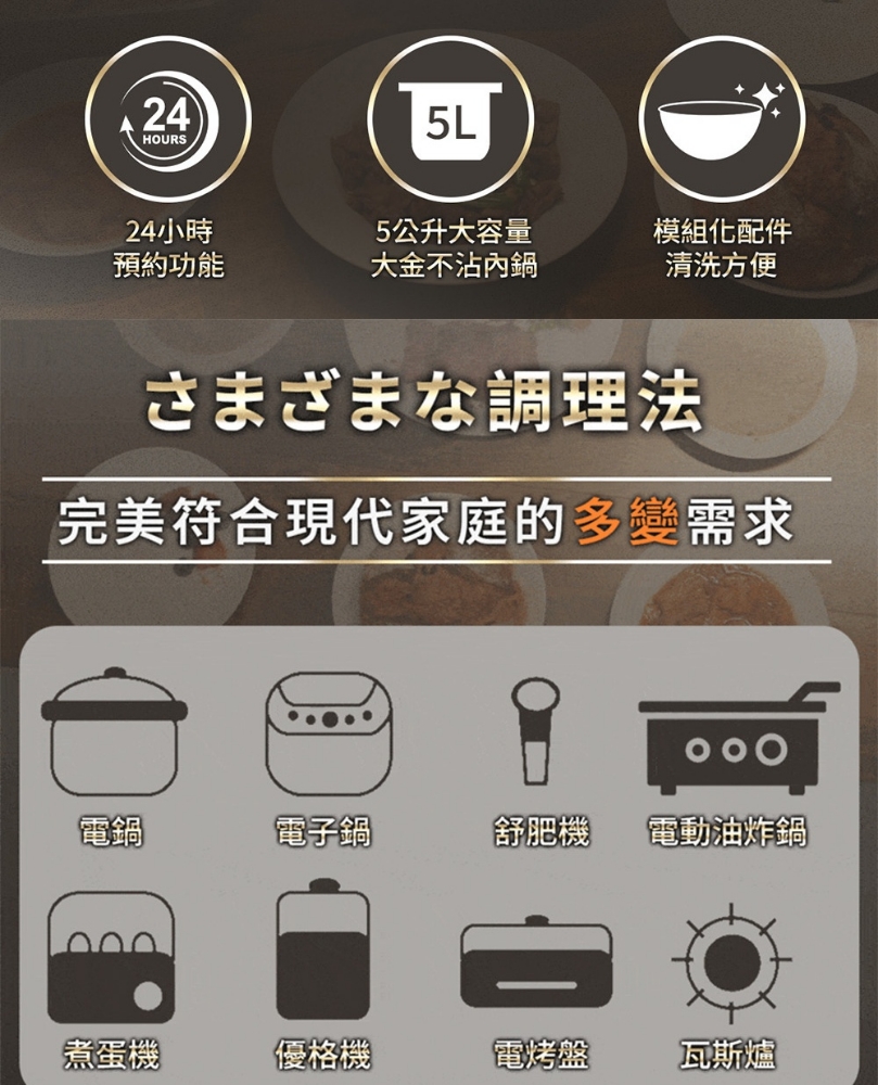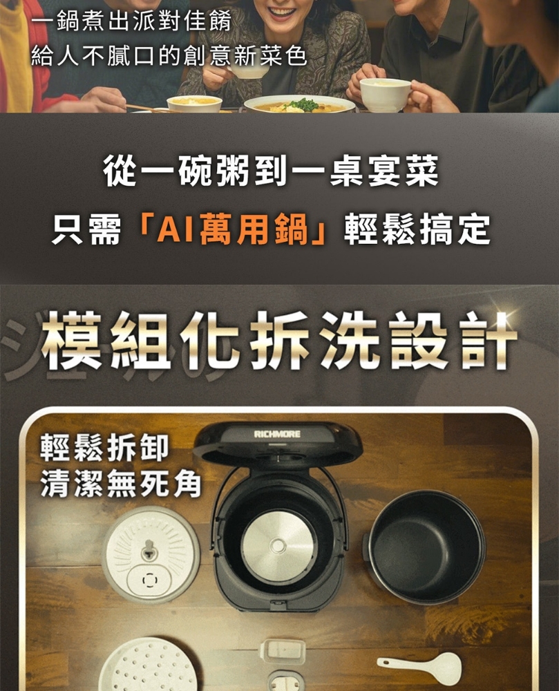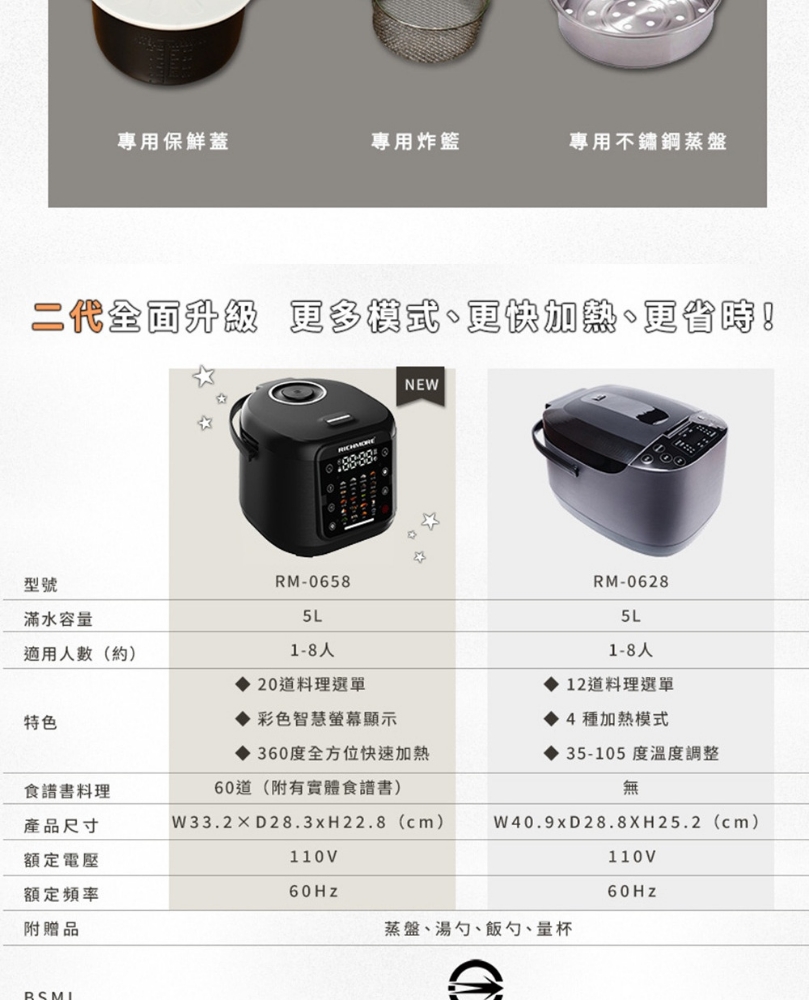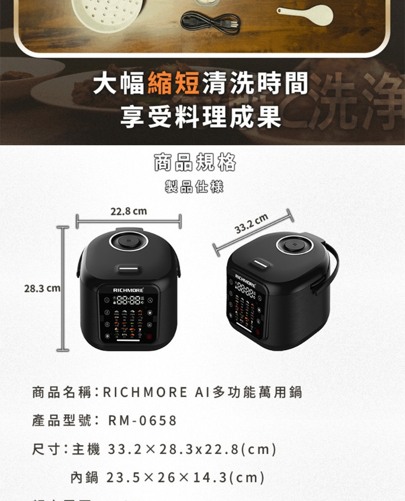 類型:微電腦電子鍋 容量:7~10人份 保固期:1年保固期 機體享一年保固服務(非人為因素破壞所導致)消耗品:內鍋、蒸盤、湯勺、飯勺、量杯,不在此保固範圍內。 商品規格 產地:中國 保固:機體享一年保固服務(非人為因素破壞所導致)消耗品:內鍋、蒸盤、湯勺、飯勺、量杯,不在此保固範圍內。 材質:機體:PP 聚丙烯 內鍋:鋁合金、日本大金塗層 保温蓋:鋁合金 蒸氣閥:食品級耐熱 PP 保溫蓋密封圈、蒸氣孔密封圈:食品級耐熱矽膠耐熱:蒸盤105℃、蒸氣閥110℃ / 密封圈 120℃ 尺寸(L*W*H):33.2x28.3x22.8(cm) 重量:4.3kg 標準配備AI電子鍋、內鍋、蒸盤、湯勺、飯勺、量杯*1 認證字號 商檢字號:ERC-1140004 |