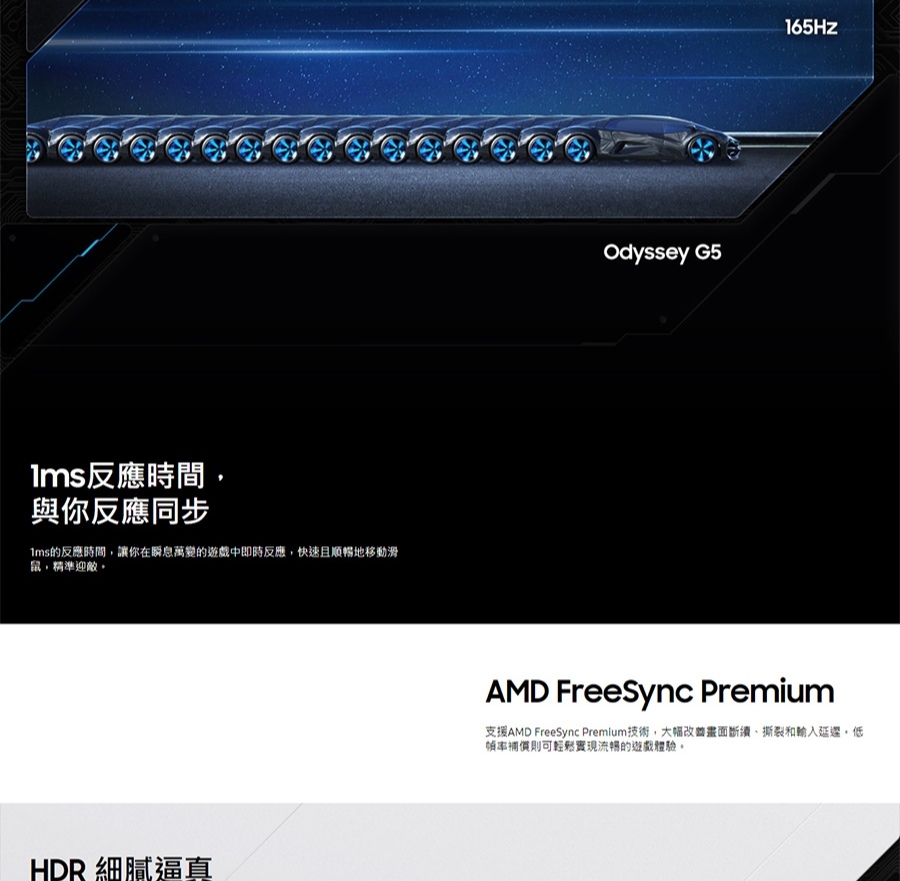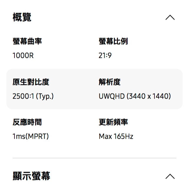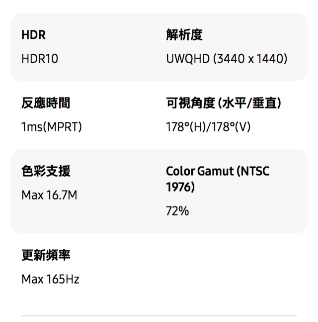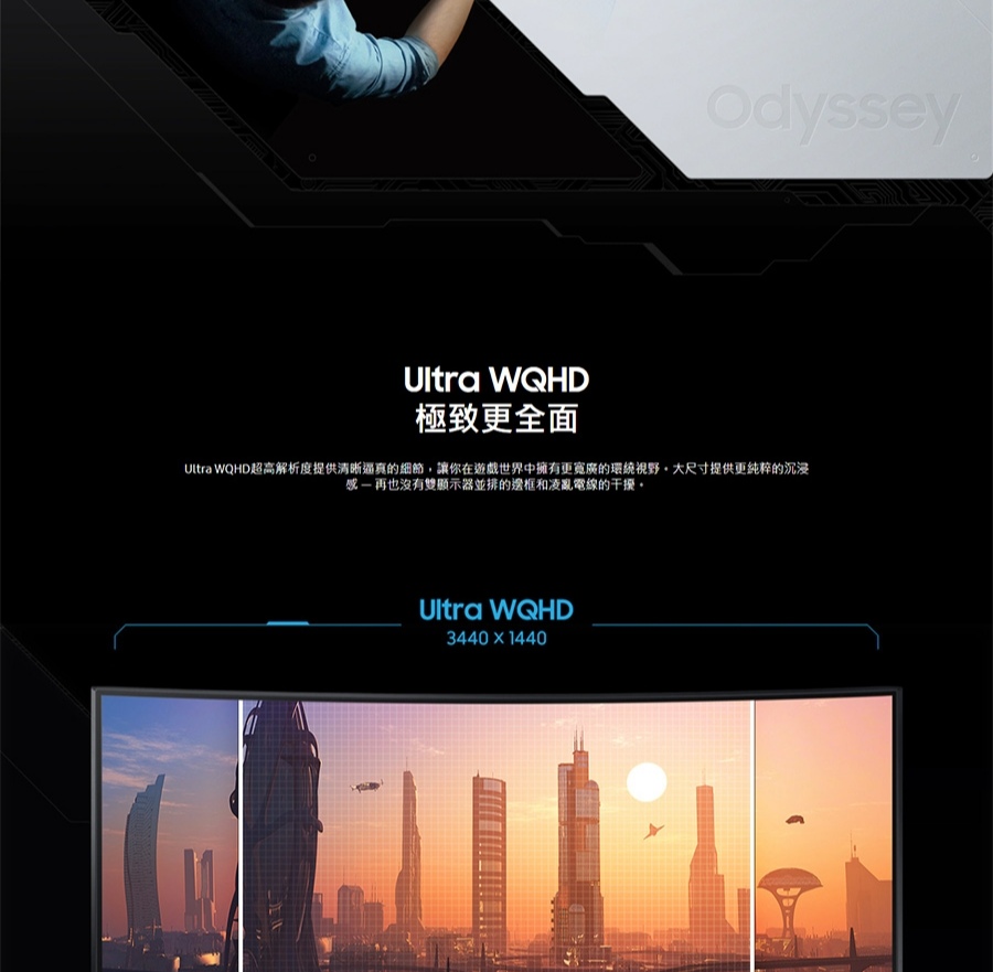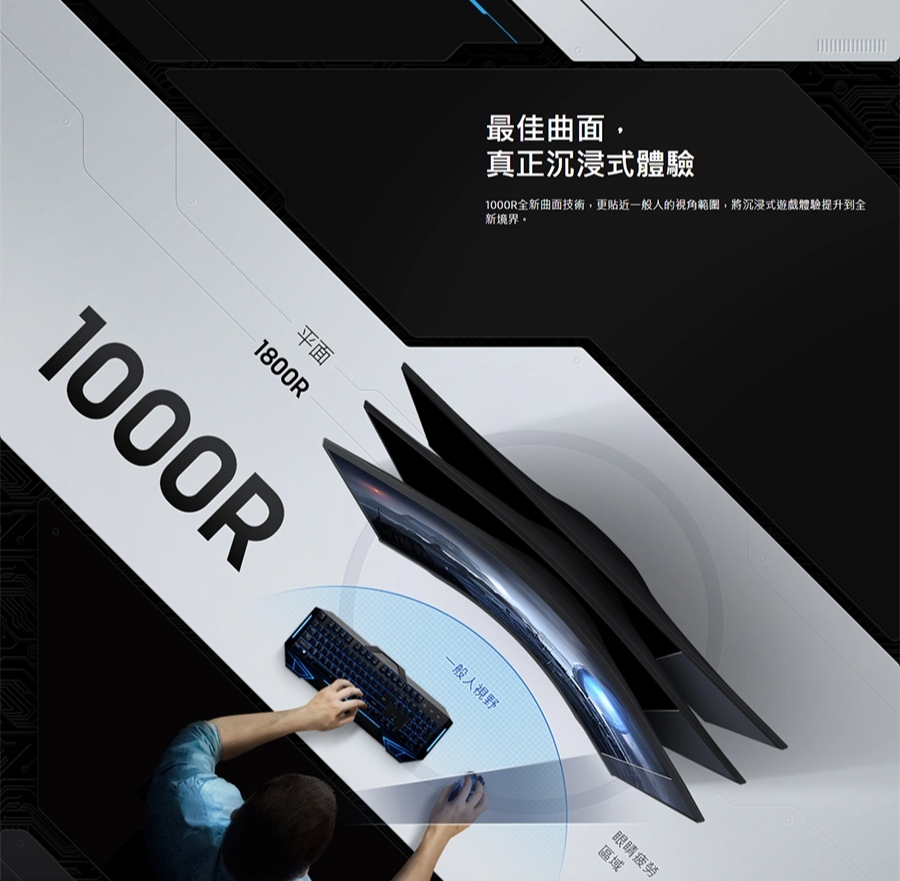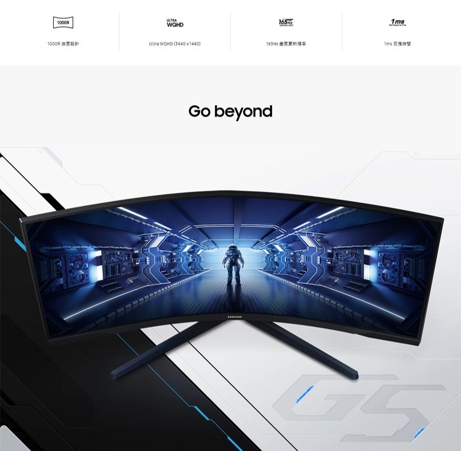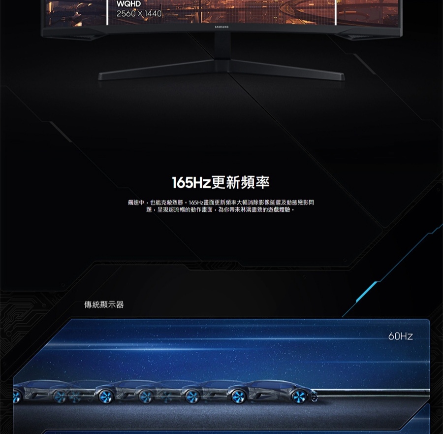 1000R 曲面設計 165Hz 畫面更新頻率 1ms(MPRT) 反應時間 Ultra WQHD (3440 x 1440) 低藍光模式 零閃屏