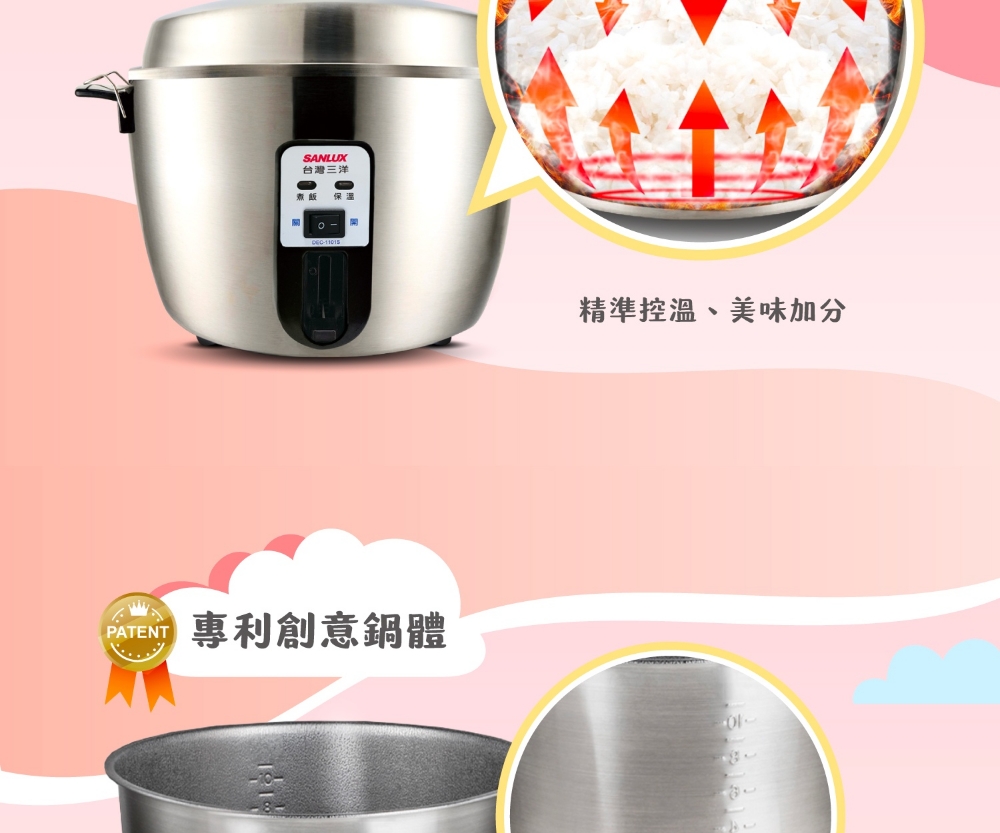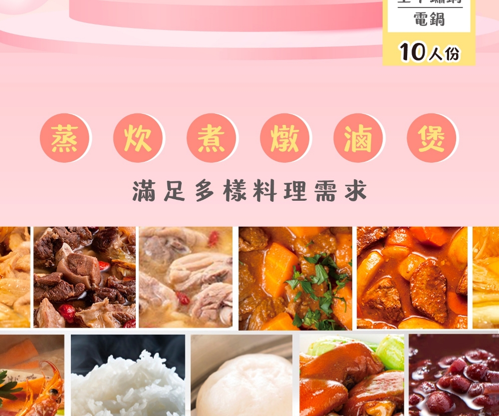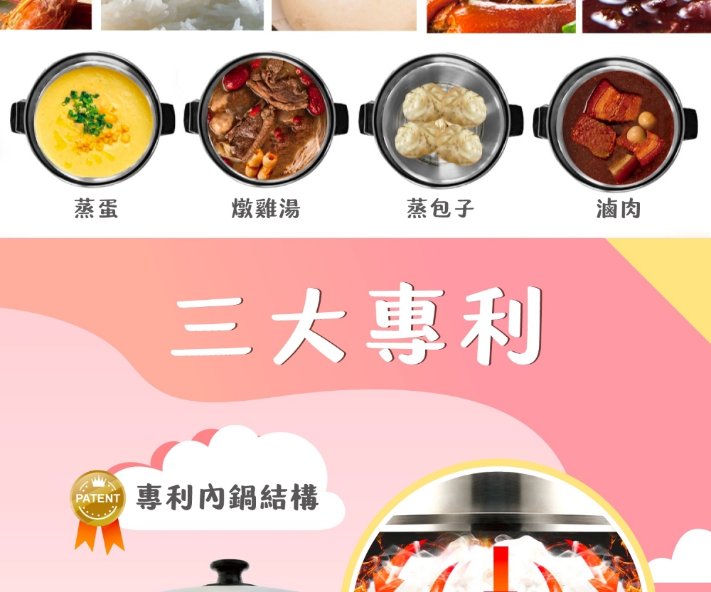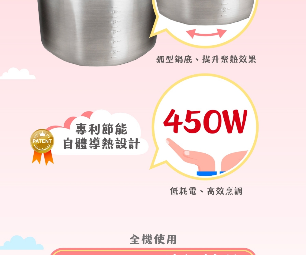 全機採用SUS304食品級不鏽鋼 獨家專利設計,同級最省電450W 煮飯、熬粥、蒸、煮、燉、滷多功能 蒸氣加濕及精準控制,使米粒Q彈爽口 能源效率等級:第3級 台灣製造