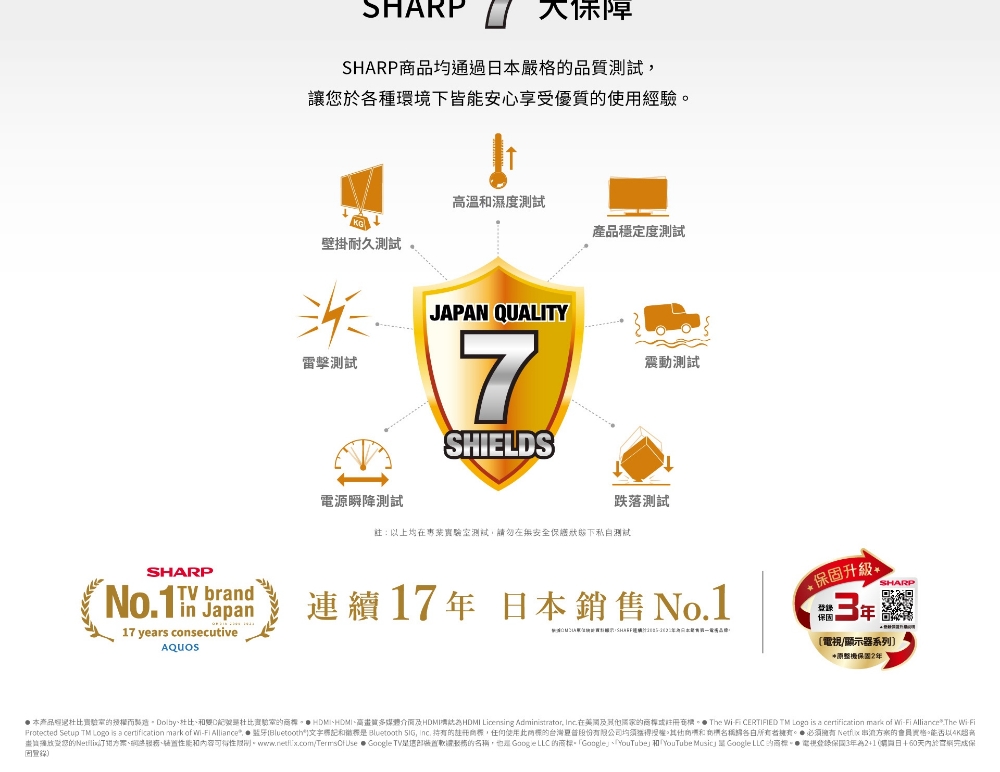7種觀賞模式 Google TV操作系統 藍牙語音遙控器 ALLM自動低延遲模式 VRR可變刷新率 品牌:SHARP夏普 型號:4T-C75GU8500X 面板尺寸(英吋):75吋 面板解析度:4K(3840 x 2160) 保固期間:2年 產地:馬來西亞 尺寸(寬x高x深):1672 x 1021 x 332 (mm) (含腳架) 重量(KG):42 Kg(不含腳架);34.5Kg(含腳架) 電視盒接收端子:無附視訊盒 電源需求:110V 倍頻:120HZ 功能選單語言:中文, 英文 喇叭輸出功率:30W(15W + 15W) 環繞音場:杜比數位音效 HDMI高畫質數位影音端子:4組 USB插槽: 2組 BSMI許可字號:R3B801 含桌上型基本安裝 |