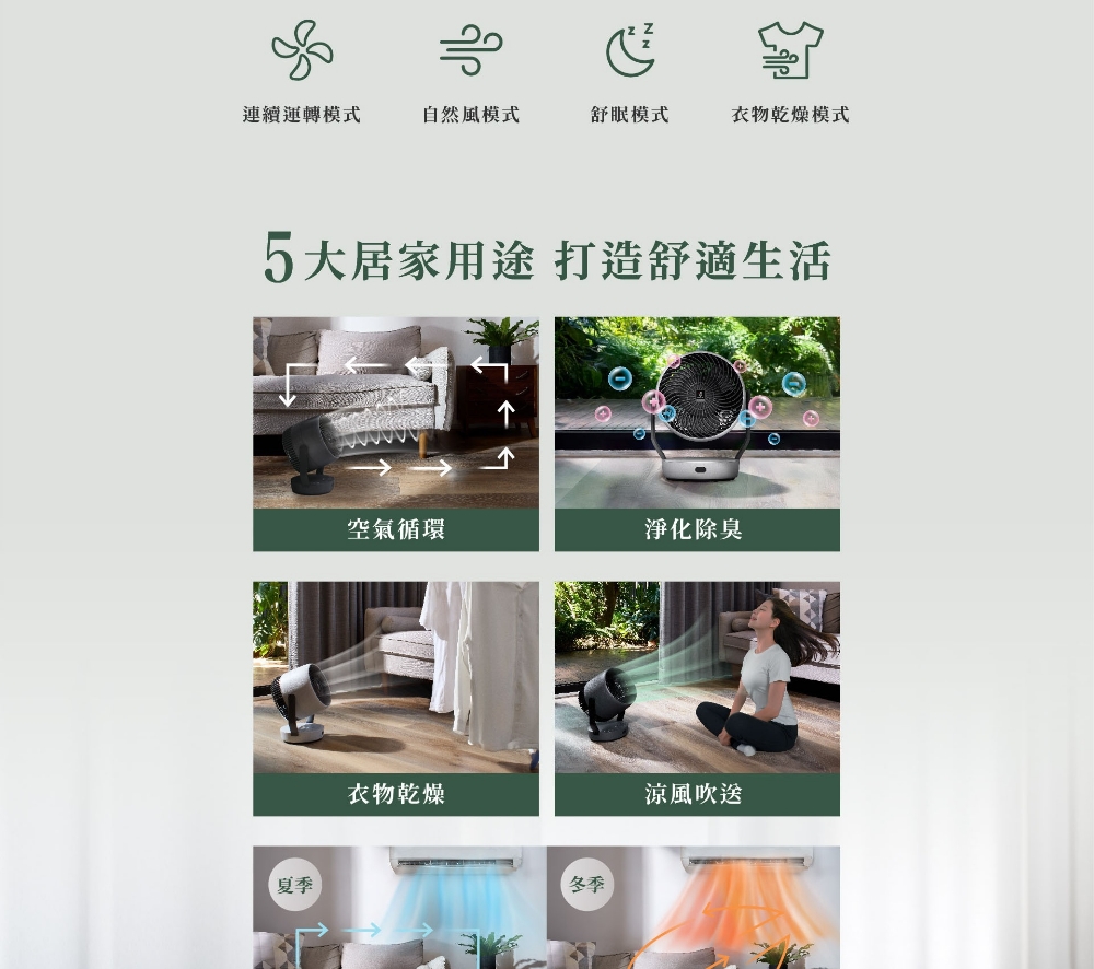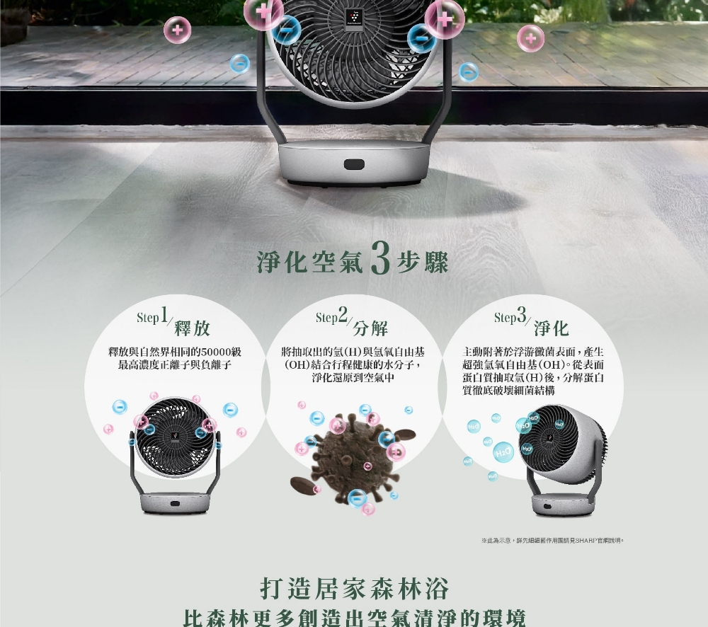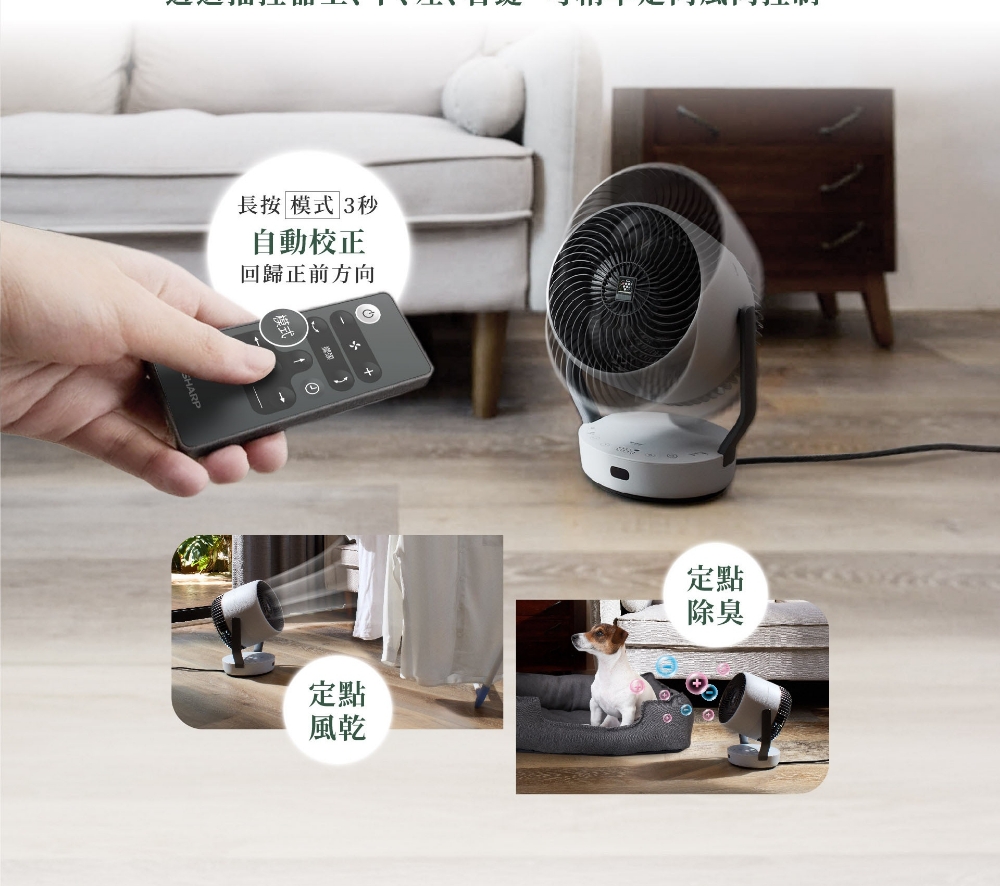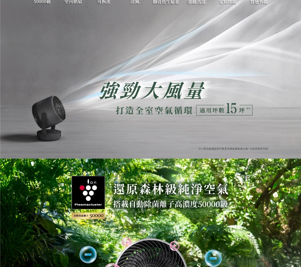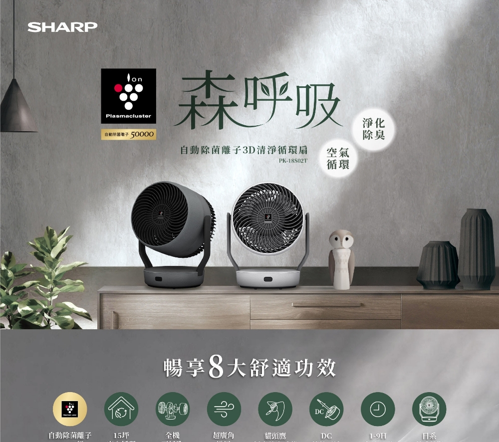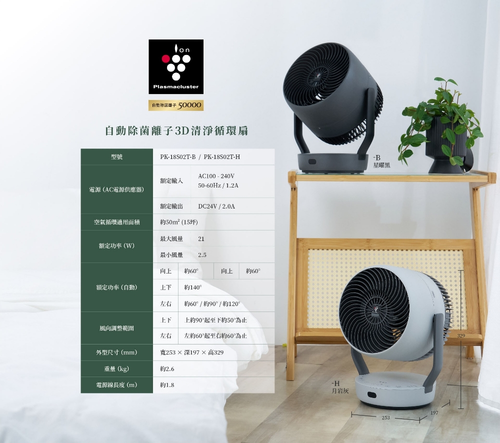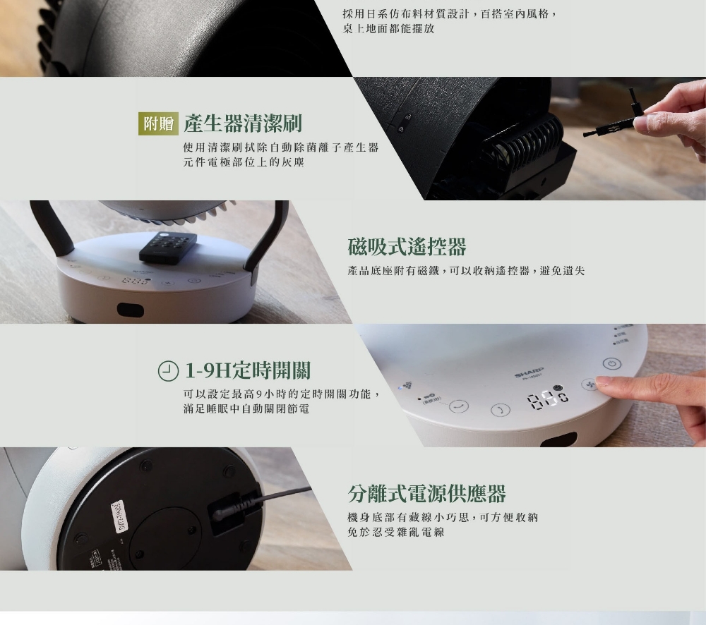 搭載 SHARP頂規50000級自動除菌離子技術(PCI),高效去除異味與空氣中有害物質 抗菌扇葉設計,讓空氣更安心 強勁風量 快速循環,10段風量調整,最大風速直送距離可達 24公尺 1~9小時定時開關,靈活掌控運作時間 4種風感模式:連續送風/衣物乾燥/自然風/舒眠靜音 小巧機身適用於 約15坪空間,空氣循環無死角 獨家 仿生貓頭鷹扇葉,大風量且低運轉行程僅 20dB極靜音* 節能低耗電設計,快速達成室內均溫,全天候舒適 上下140°+左右120°,實現真正 3D立體送風 精準擺頭結構,上下左右皆可獨立調整 全機可拆洗設計:前罩、後罩、扇葉均可水洗,保持風扇潔淨如新 磁吸式遙控器,收納與操作一手掌握 兒童安全鎖設計,守護居家使用安全 採用日系仿布料質感外殼,雙色搭配,融入居家風格