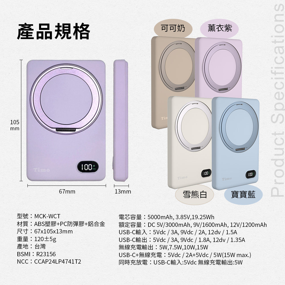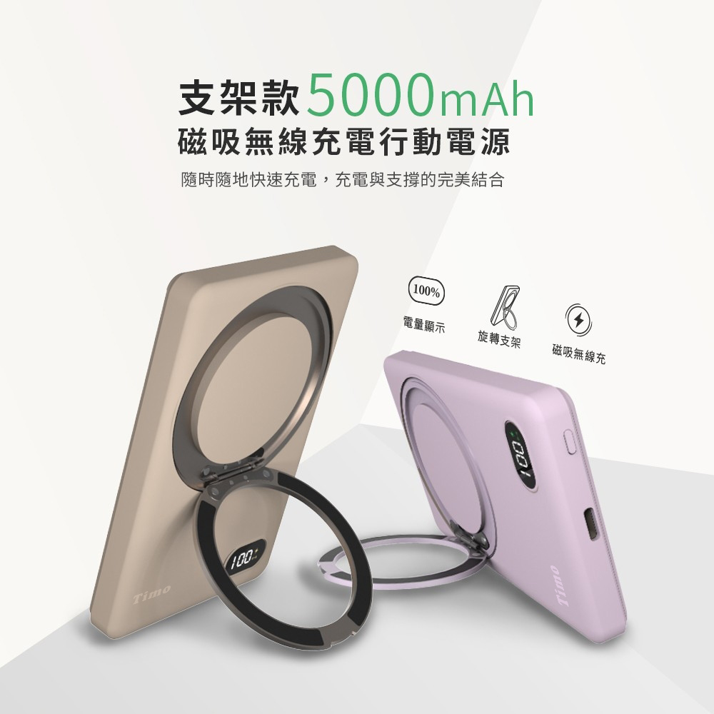 【Timo】旋轉支架款 磁吸無線充行動電源 5000mAh-薰衣紫